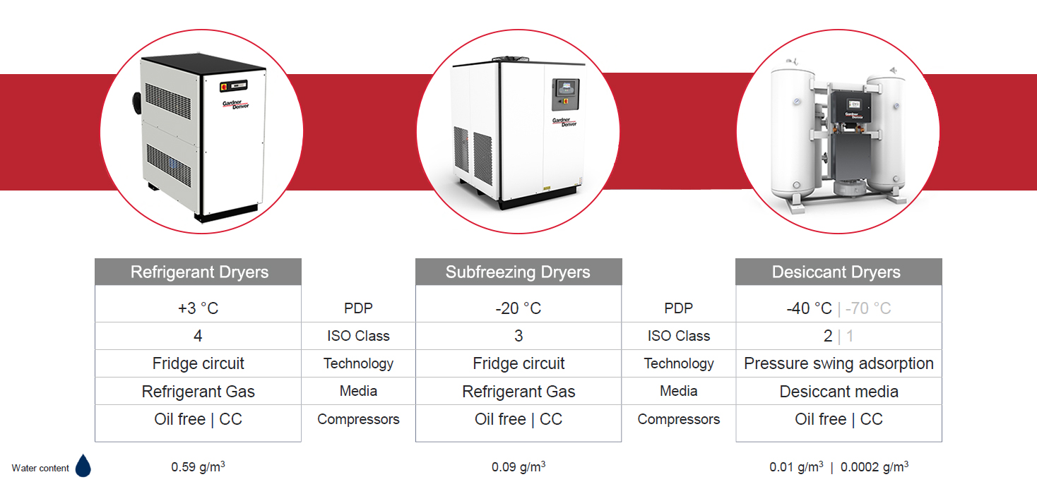 Zawartość wody w sprężonym powietrzu jest mierzona w PDP, czyli ciśnieniowym punkcie rosy. Jest to temperatura, w której para wodna (gaz) skrapla się w wodę (stan ciekły) przy bieżącym ciśnieniu roboczym.