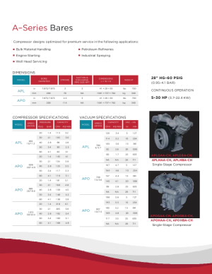 A reputação da série A foi conquistada por sua qualidade, confiabilidade e acesso a todos os componentes. Os produtos incluem compressores abertos arrefecidos a ar, reforçadores e bombas de vácuo. Os compressores da série A têm construção em ferro fundido para serviço pesado, árvore de manivelas com contrapeso para garantir uma operação suave e cilindros e cabeças com aletas profundas, que dissipam o calor da compressão rapidamente.